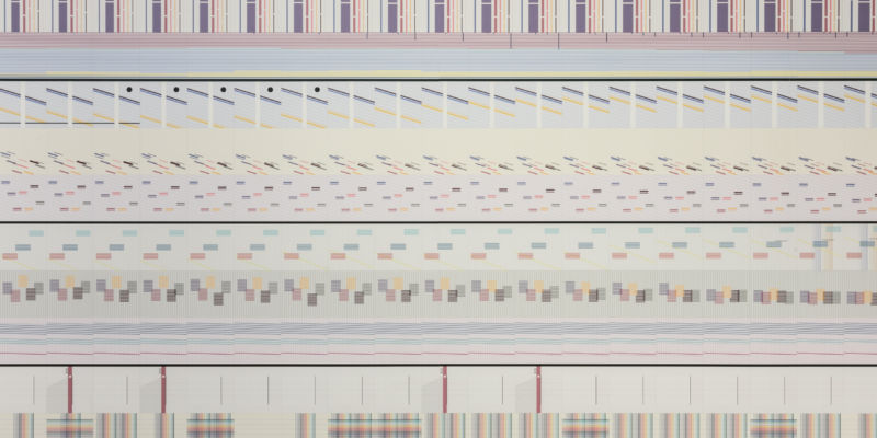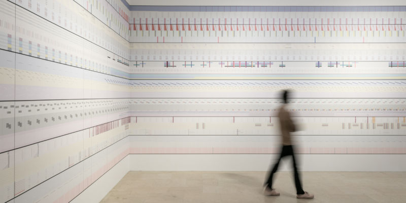 They are illustrated through a number of global data sets (world population, average temperatures, disease rates, energy consumption, etc.) to frame large-scale phenomena with broad strokes as well as single and specific stories that will directly or indirectly represent the micro consequences of the large-scale phenomena (such as the disappearing Aral Sea, the dip in life expectancy in Cambodia during its civil war, the quick shift in South Korean exports from agricultural products and commodities to high tech, and more). Most of the change we experience is only shown to us from far away and high above. At first glance, a visitor might not even realize that data is the organizing principle of the motif. However, The Room of Change has been envisioned as a data-driven wallpaper creating a morphing visual pattern that unveils the importance of a perpetual interplay of scales and dimensions when assessing change, and illustrates the evolution of many recurring themes of the show: a subtle and poetic tapestry depicting change, from our past to our present to our future. Each of the visual components defining the pattern is a theme, and each vertical section of the wall becomes a snapshot of a precise moment frozen in time.