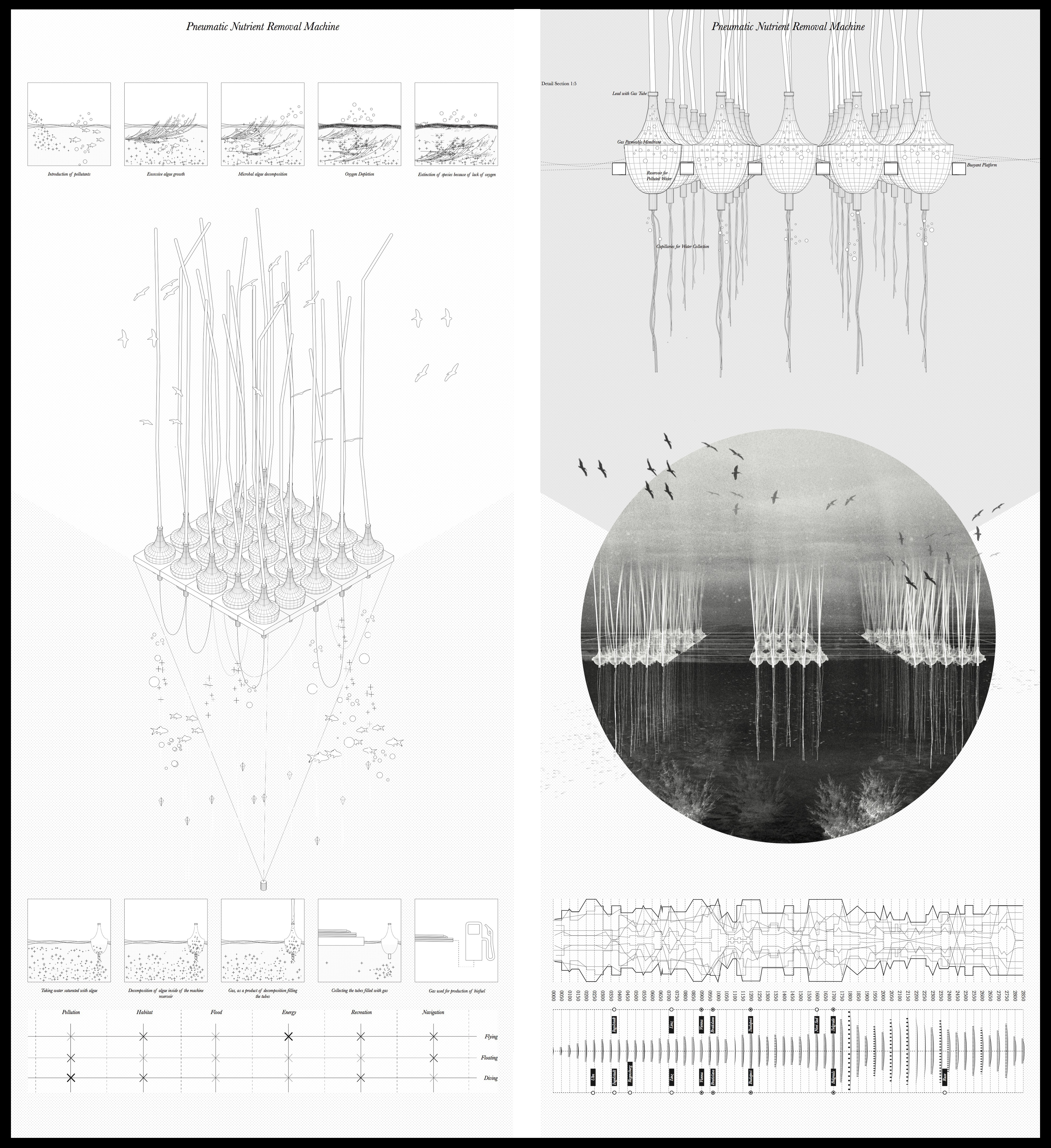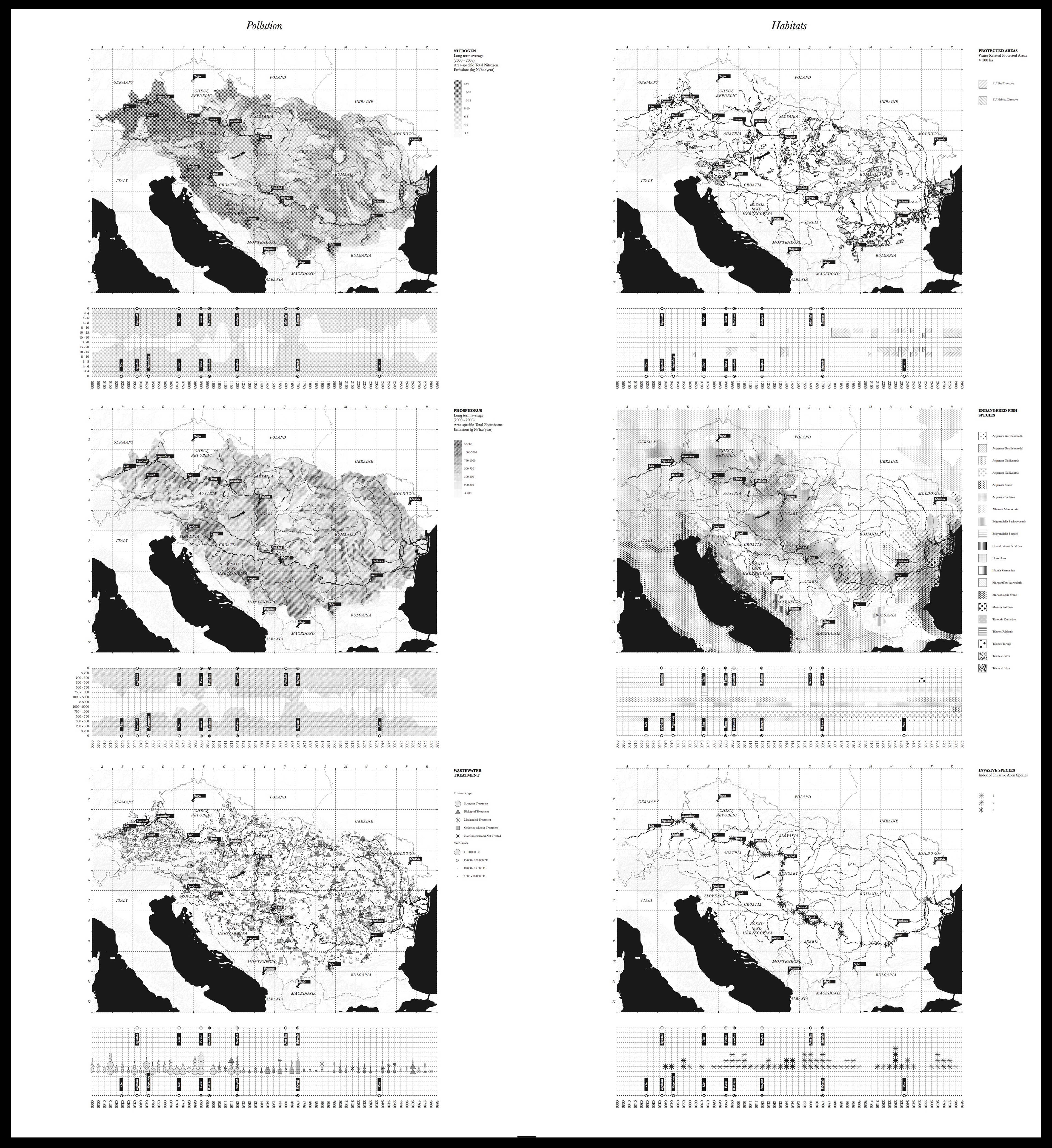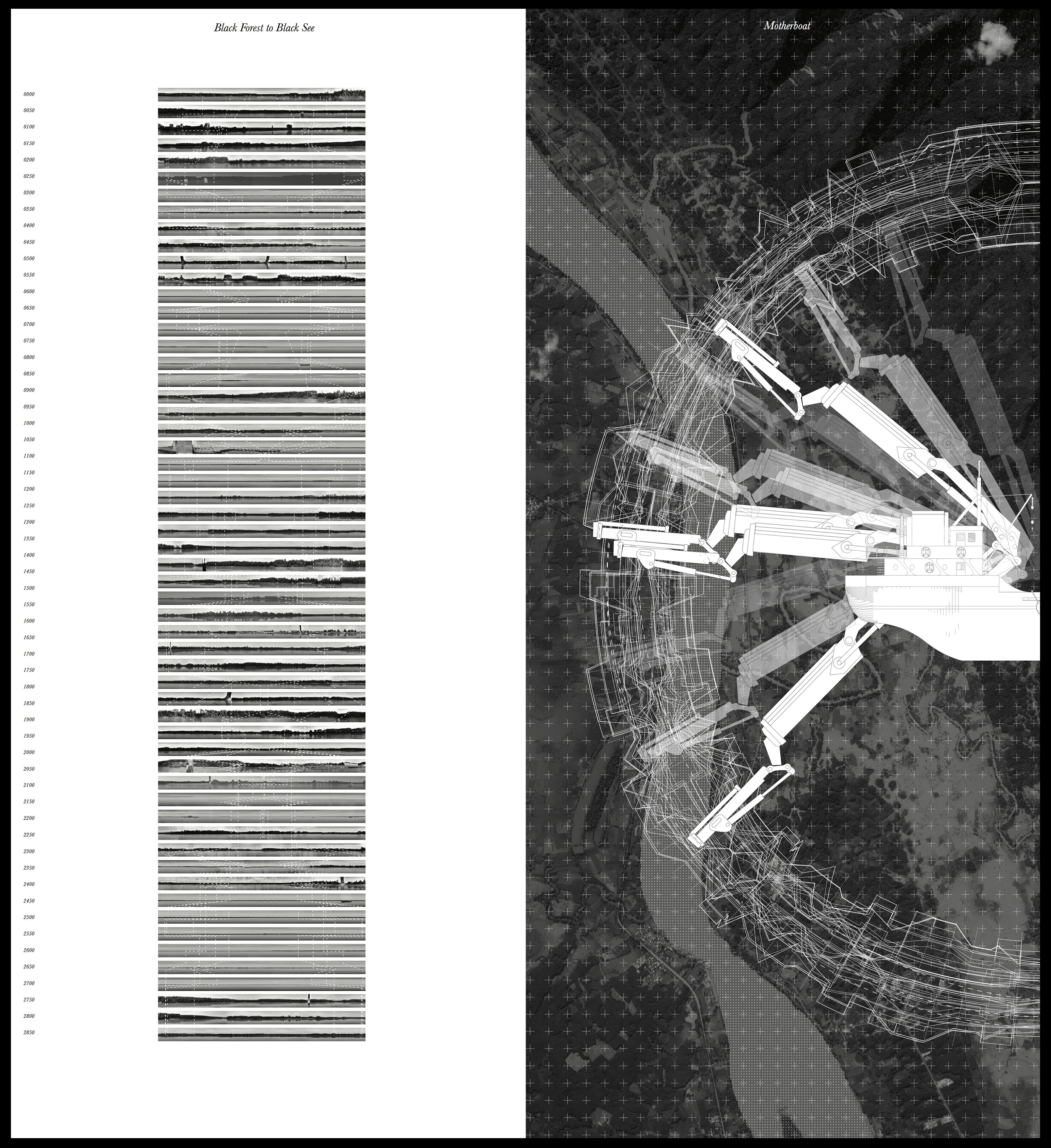 The proposal is situated in the territory of the Danube Basin, a place of transition, right where the fluctuating and ephemeral nature of its substance, water, is manifested. The River Danube has been and still is an infrastructure that promises a space of possibility, of expectation. Instead of thinking of the River Danube as a depot of our superfluous energy, this proposal imagines a possible Cyborg Landscape, an organism that has restored meaning and enhanced abilities due to the integration of artificial components and technology that rely on feedback. A network of devices that are responsive, adaptable, scalable, non-linear, and multivalent will be integrated above/on/into the water, assimilated in a landscape pattern gradient constructed on symmetric probability distribution. The landscape is performance, a tactical archipelago of living mechanisms.