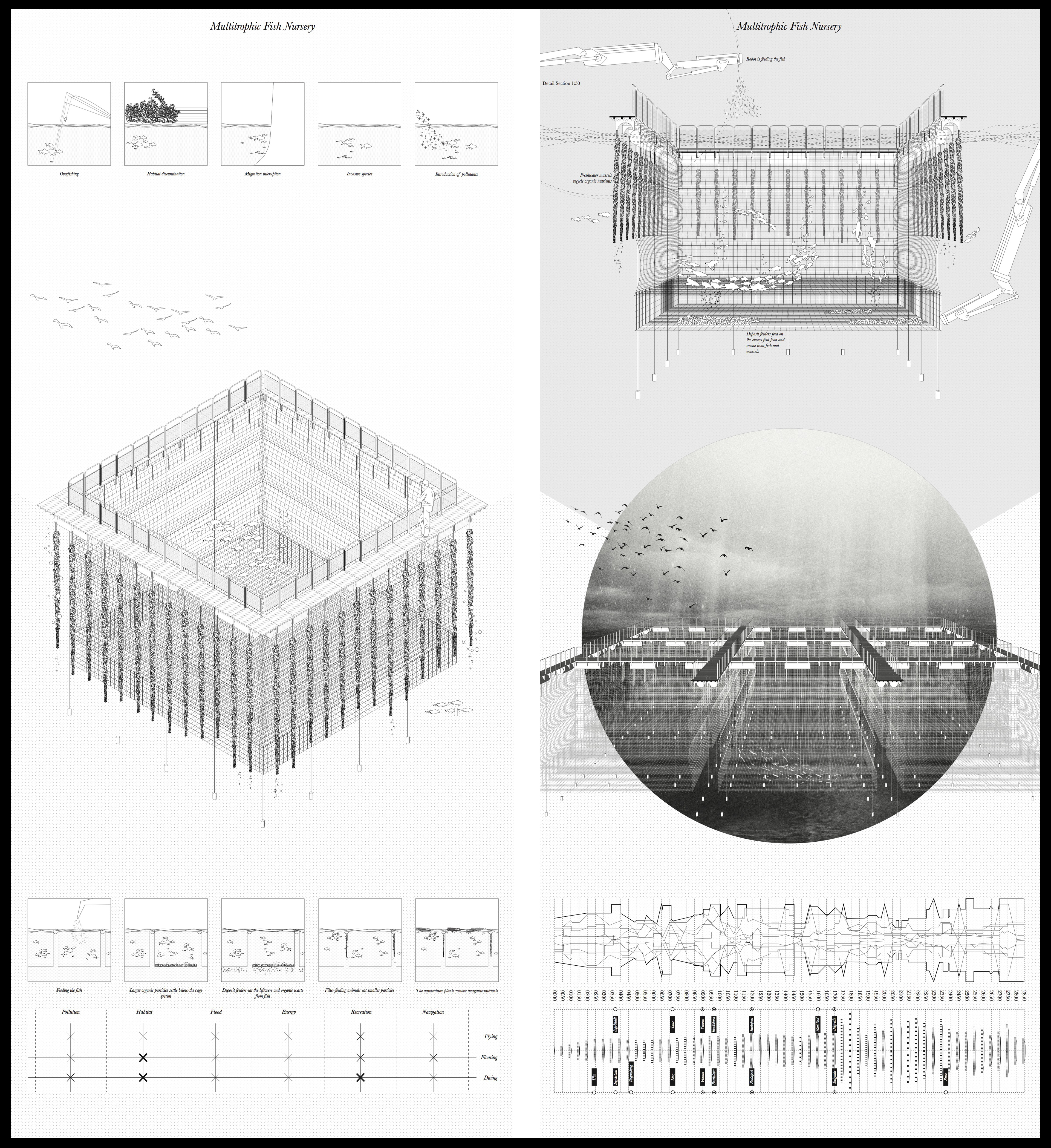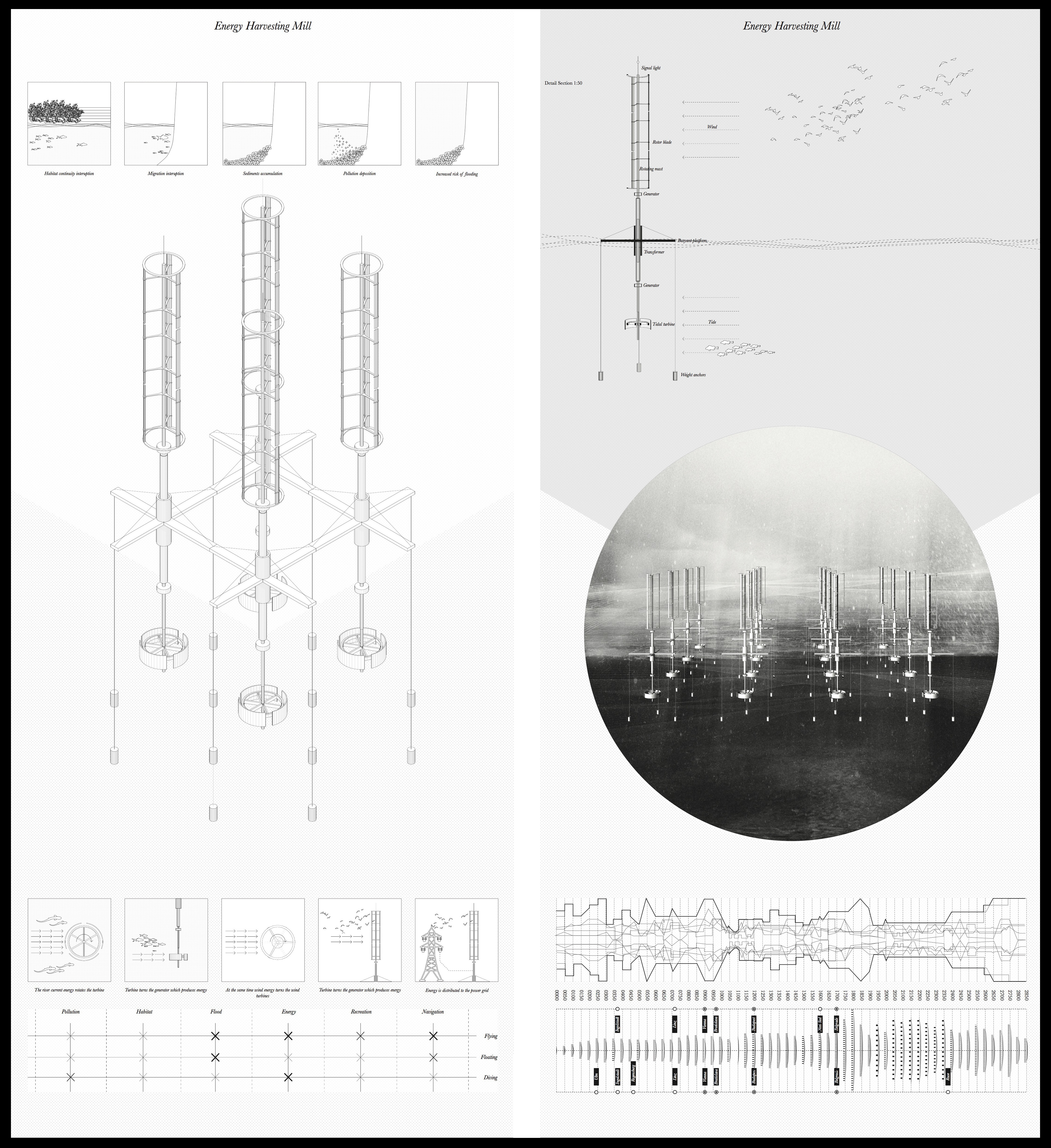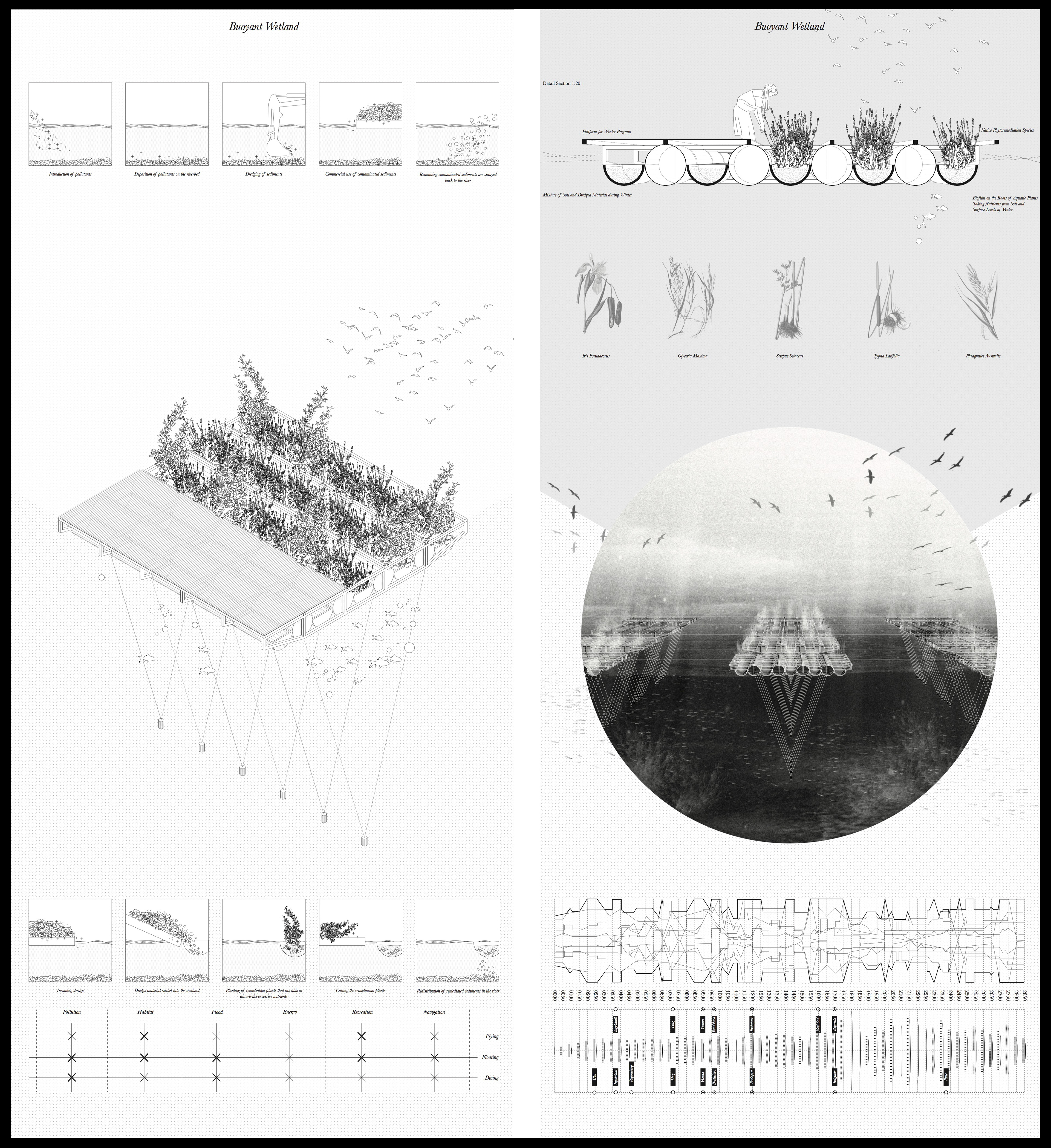 The proposal is situated in the territory of the Danube Basin, a place of transition, right where the fluctuating and ephemeral nature of its substance, water, is manifested. The River Danube has been and still is an infrastructure that promises a space of possibility, of expectation. Instead of thinking of the River Danube as a depot of our superfluous energy, this proposal imagines a possible Cyborg Landscape, an organism that has restored meaning and enhanced abilities due to the integration of artificial components and technology that rely on feedback. A network of devices that are responsive, adaptable, scalable, non-linear, and multivalent will be integrated above/on/into the water, assimilated in a landscape pattern gradient constructed on symmetric probability distribution. The landscape is performance, a tactical archipelago of living mechanisms.
