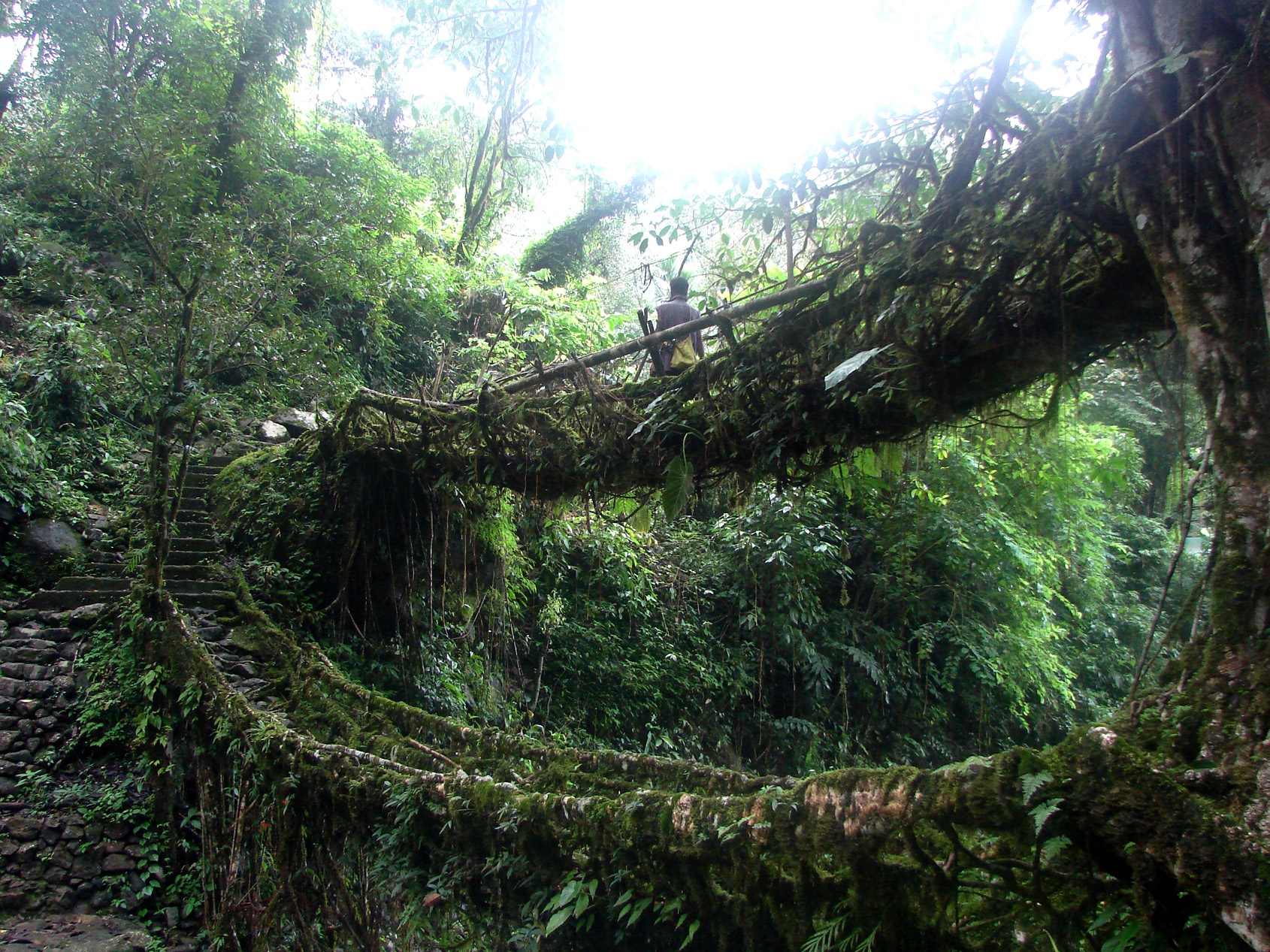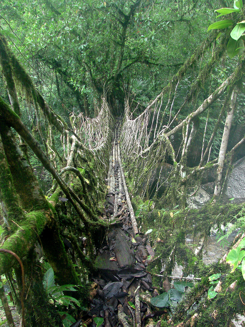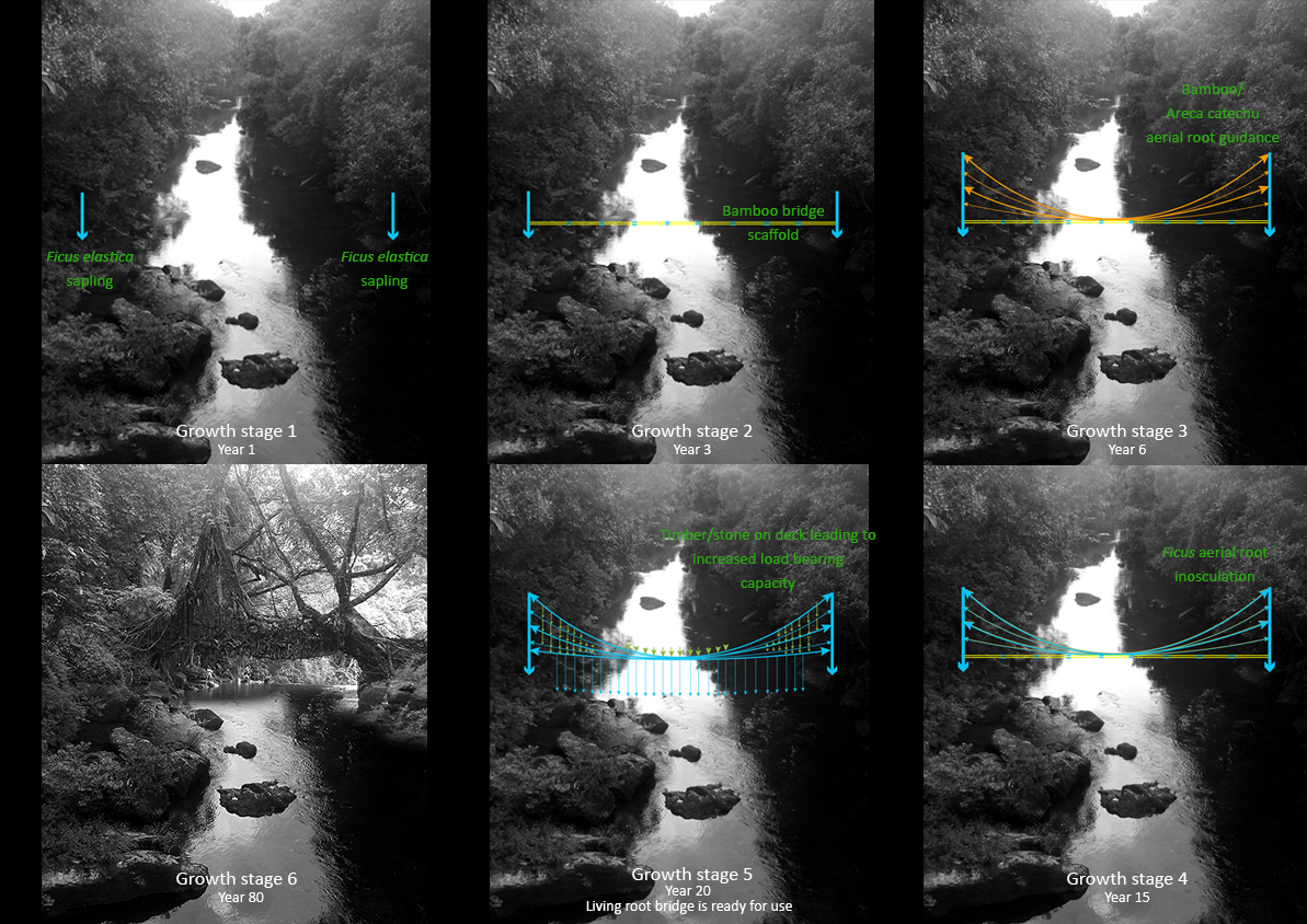 Locally known as jingkieng jri, Living Root Bridges are Ficus elastica-based infrastructure and landscape solutions within dense sub tropical moist broadleaf forests of North Eastern Indian Himalayas (25°30’N and 91°00’E). As living plant-based ecosystems, these structures are grown and nurtured by indigenous Khasi and Jaintia tribes of Meghalaya over 10 to 30 years and perform for several centuries in extreme climatic conditions. With 1) low material and maintenance cost, 2) progressive increase in strength and performance, 3) community-led participatory design approach across multiple generations, 4) remedial impact on surrounding soil, water and air, 5) support for other plant and animal systems, 6) keystone role of Ficus plant species in local ecology, and 7) diverse morphologies including bridges, ladders, towers, platforms and soil erosion/landslide prevention structures, Ficus-based living root bridge ecosystems offer an important model for reimagining our environment and reviving our relationship with nature.